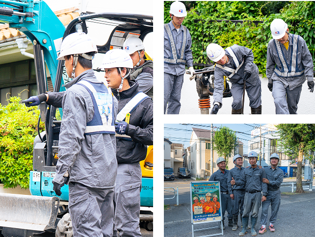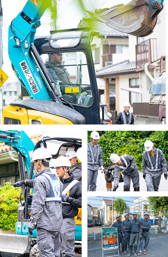 現場は屋外が中心で、水道管の敷設や道路の舗装、